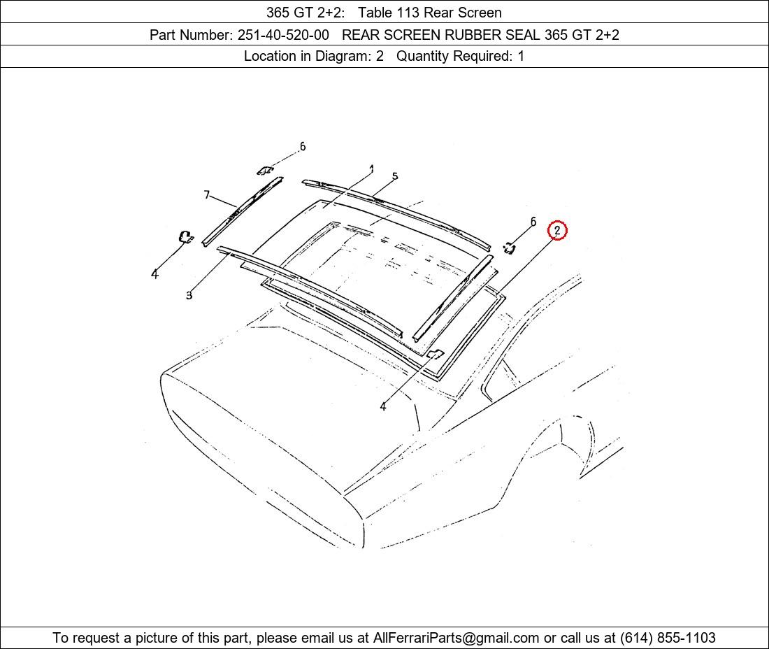 Ferrari Part Number 251-40-520-00, REAR SCREEN RUBBER SEAL 365 GT 2+2 shown here as used in 365 GT 2+2 Table 113 Rear Screen. Location in Diagram: 2. Required Quantity: 1