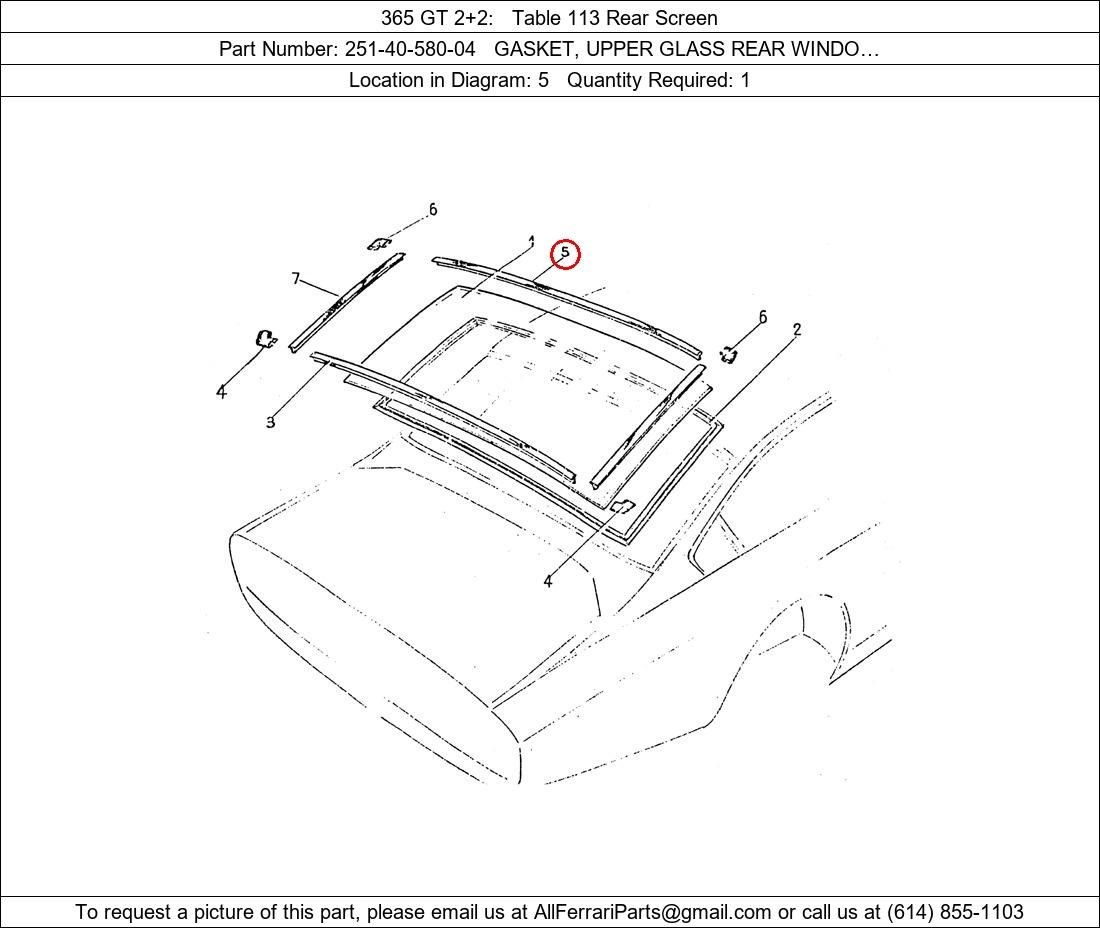 Ferrari Part Number 251-40-580-04, GASKET, UPPER GLASS REAR WINDO… shown here as used in 365 GT 2+2 Table 113 Rear Screen. Location in Diagram: 5. Required Quantity: 1