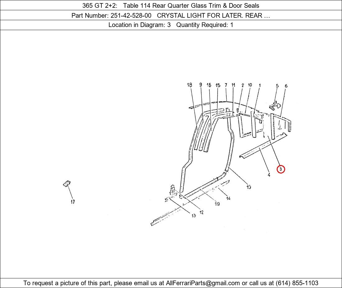 Ferrari Part Number 251-42-528-00, CRYSTAL LIGHT FOR LATER. REAR … shown here as used in 365 GT 2+2 Table 114 Rear Quarter Glass Trim & Door Seals. Location in Diagram: 3. Required Quantity: 1. This Ferrari part is used in more than one diagram. Click on the diagrams below to see alternative uses of this part: