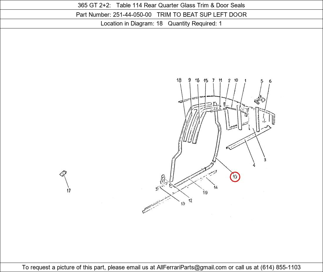 Ferrari Part Number 251-44-050-00, TRIM TO BEAT SUP LEFT DOOR shown here as used in 365 GT 2+2 Table 114 Rear Quarter Glass Trim & Door Seals. Location in Diagram: 18. Required Quantity: 1. This Ferrari part is used in more than one diagram. Click on the diagrams below to see alternative uses of this part: