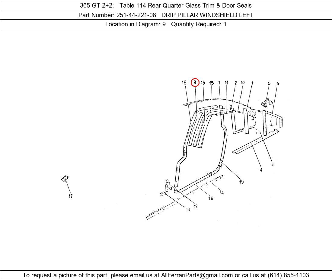 Ferrari Part Number 251-44-221-08, DRIP PILLAR WINDSHIELD LEFT shown here as used in 365 GT 2+2 Table 114 Rear Quarter Glass Trim & Door Seals. Location in Diagram: 9. Required Quantity: 1. This Ferrari part is used in more than one diagram. Click on the diagrams below to see alternative uses of this part: