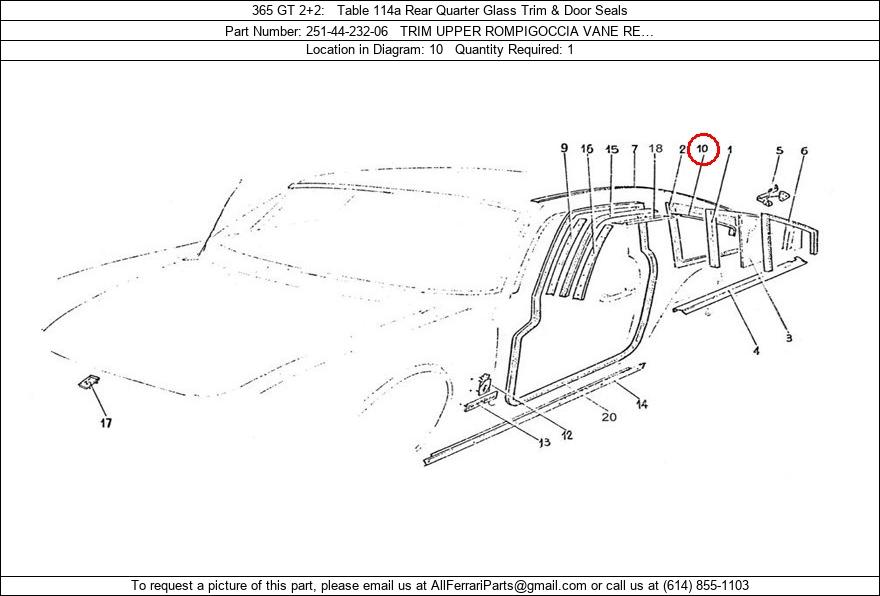 Ferrari Part Number 251-44-232-06, TRIM UPPER ROMPIGOCCIA VANE RE… shown here as used in 365 GT 2+2 Table 114a Rear Quarter Glass Trim & Door Seals. Location in Diagram: 10. Required Quantity: 1. This Ferrari part is used in more than one diagram. Click on the diagrams below to see alternative uses of this part:
