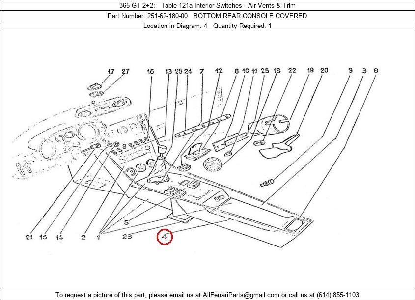 Ferrari Part Number 251-62-180-00, BOTTOM REAR CONSOLE COVERED shown here as used in 365 GT 2+2 Table 121a Interior Switches - Air Vents & Trim. Location in Diagram: 4. Required Quantity: 1. This Ferrari part is used in more than one diagram. Click on the diagrams below to see alternative uses of this part: