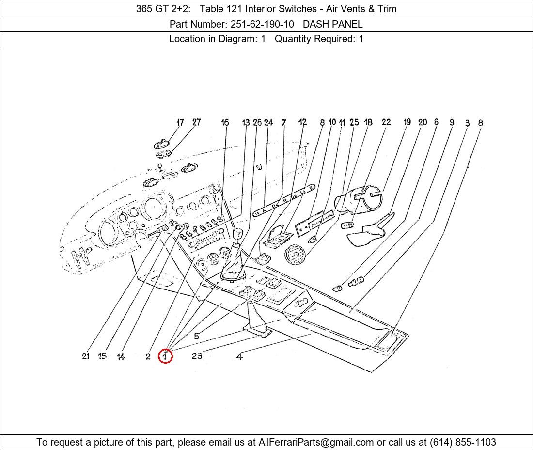 Ferrari Part Number 251-62-190-10, DASH PANEL shown here as used in 365 GT 2+2 Table 121 Interior Switches - Air Vents & Trim. Location in Diagram: 1. Required Quantity: 1