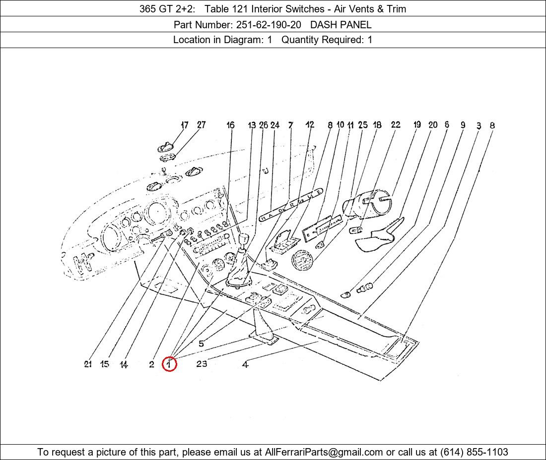 Ferrari Part Number 251-62-190-20, DASH PANEL shown here as used in 365 GT 2+2 Table 121 Interior Switches - Air Vents & Trim. Location in Diagram: 1. Required Quantity: 1