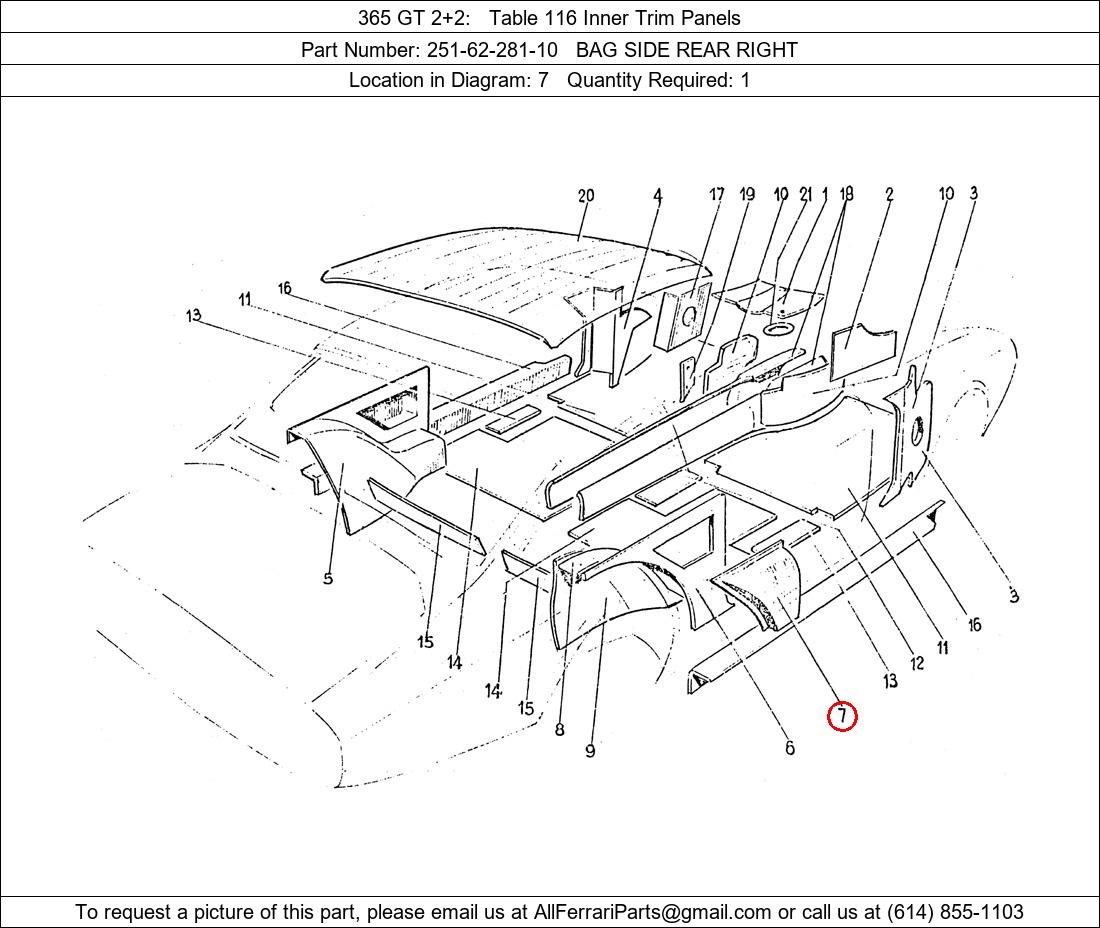 Ferrari Part Number 251-62-281-10, BAG SIDE REAR RIGHT shown here as used in 365 GT 2+2 Table 116 Inner Trim Panels. Location in Diagram: 7. Required Quantity: 1