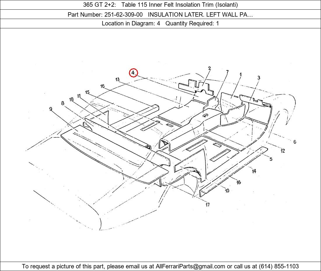Ferrari Part Number 251-62-309-00, INSULATION LATER. LEFT WALL PA… shown here as used in 365 GT 2+2 Table 115 Inner Felt Insolation Trim (Isolanti). Location in Diagram: 4. Required Quantity: 1