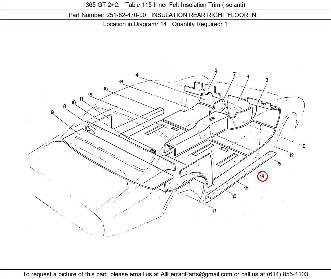 Ferrari Part Number 251-62-470-00, INSULATION REAR RIGHT FLOOR IN… shown here as used in 365 GT 2+2 Table 115 Inner Felt Insolation Trim (Isolanti). Location in Diagram: 14. Required Quantity: 1