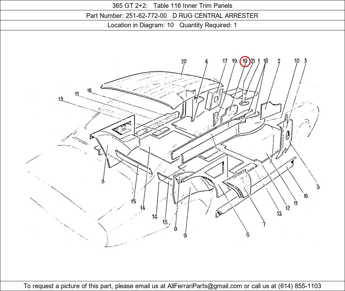 Ferrari Part Number 251-62-772-00, D RUG CENTRAL ARRESTER shown here as used in 365 GT 2+2 Table 116 Inner Trim Panels. Location in Diagram: 10. Required Quantity: 1