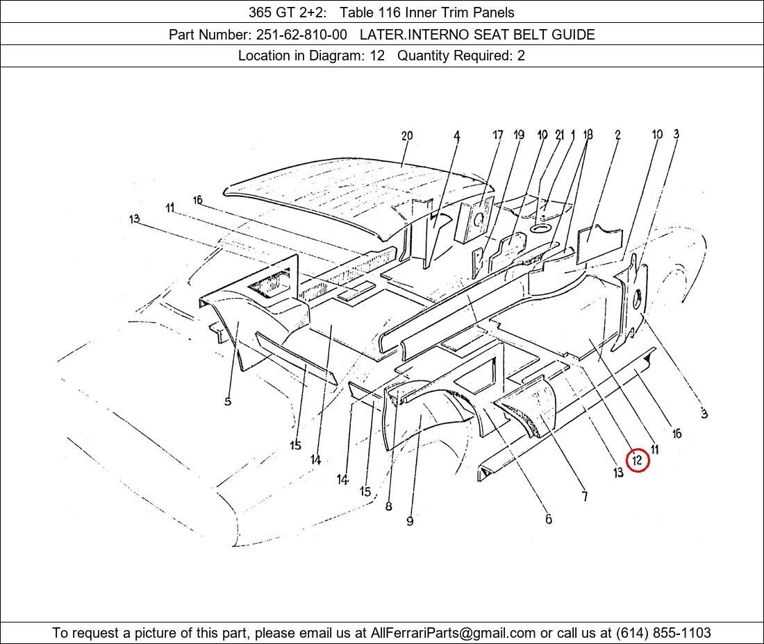 Ferrari Part Number 251-62-810-00, LATER.INTERNO SEAT BELT GUIDE shown here as used in 365 GT 2+2 Table 116 Inner Trim Panels. Location in Diagram: 12. Required Quantity: 2