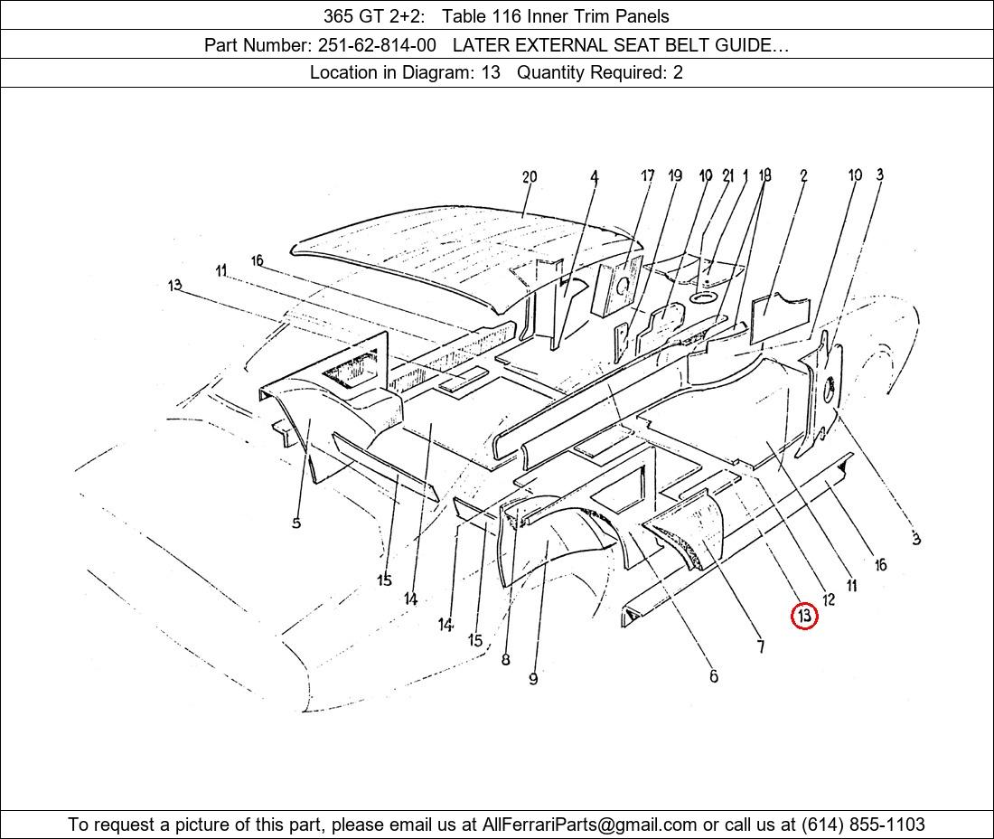 Ferrari Part Number 251-62-814-00, LATER EXTERNAL SEAT BELT GUIDE… shown here as used in 365 GT 2+2 Table 116 Inner Trim Panels. Location in Diagram: 13. Required Quantity: 2