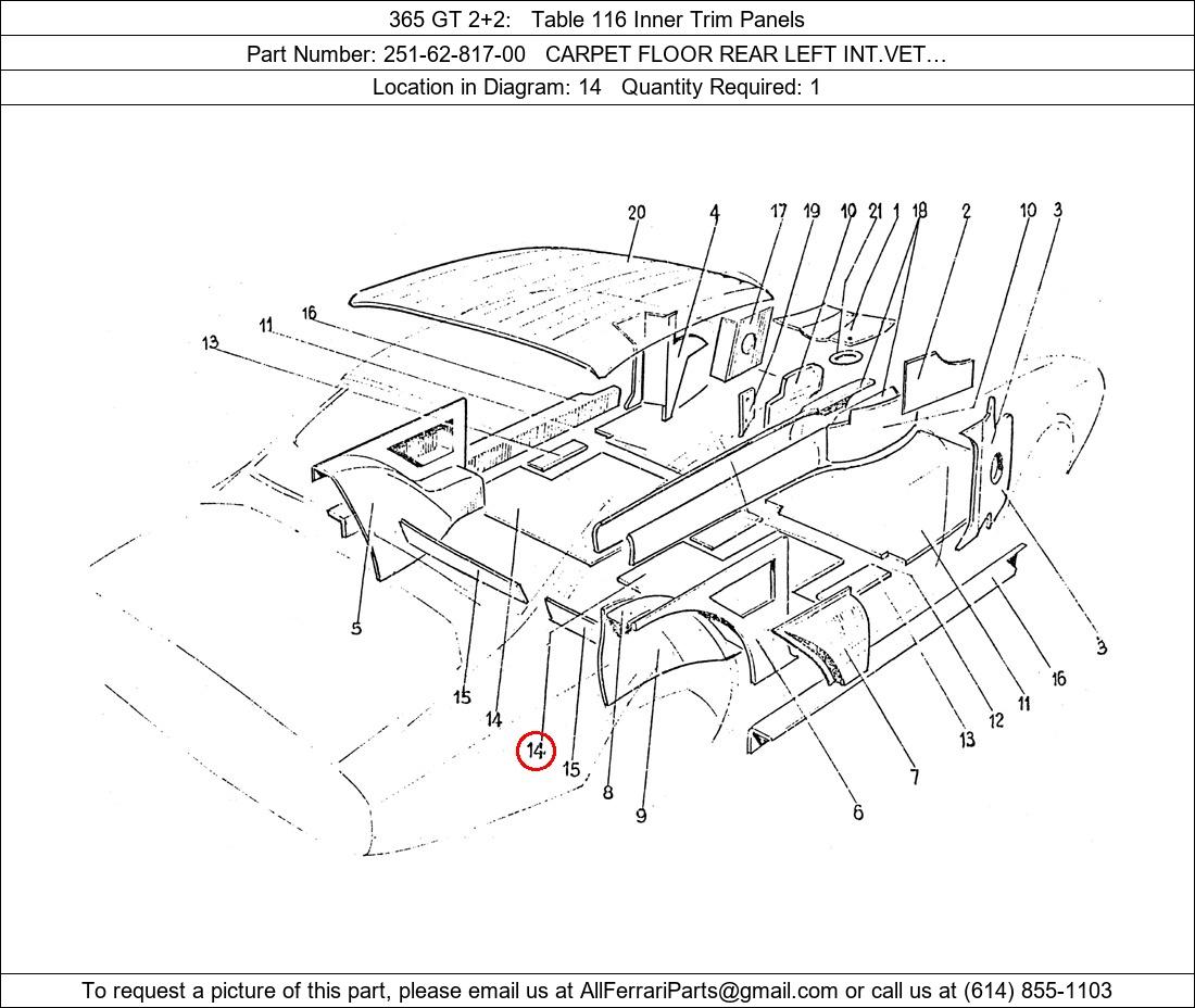 Ferrari Part Number 251-62-817-00, CARPET FLOOR REAR LEFT INT.VET… shown here as used in 365 GT 2+2 Table 116 Inner Trim Panels. Location in Diagram: 14. Required Quantity: 1