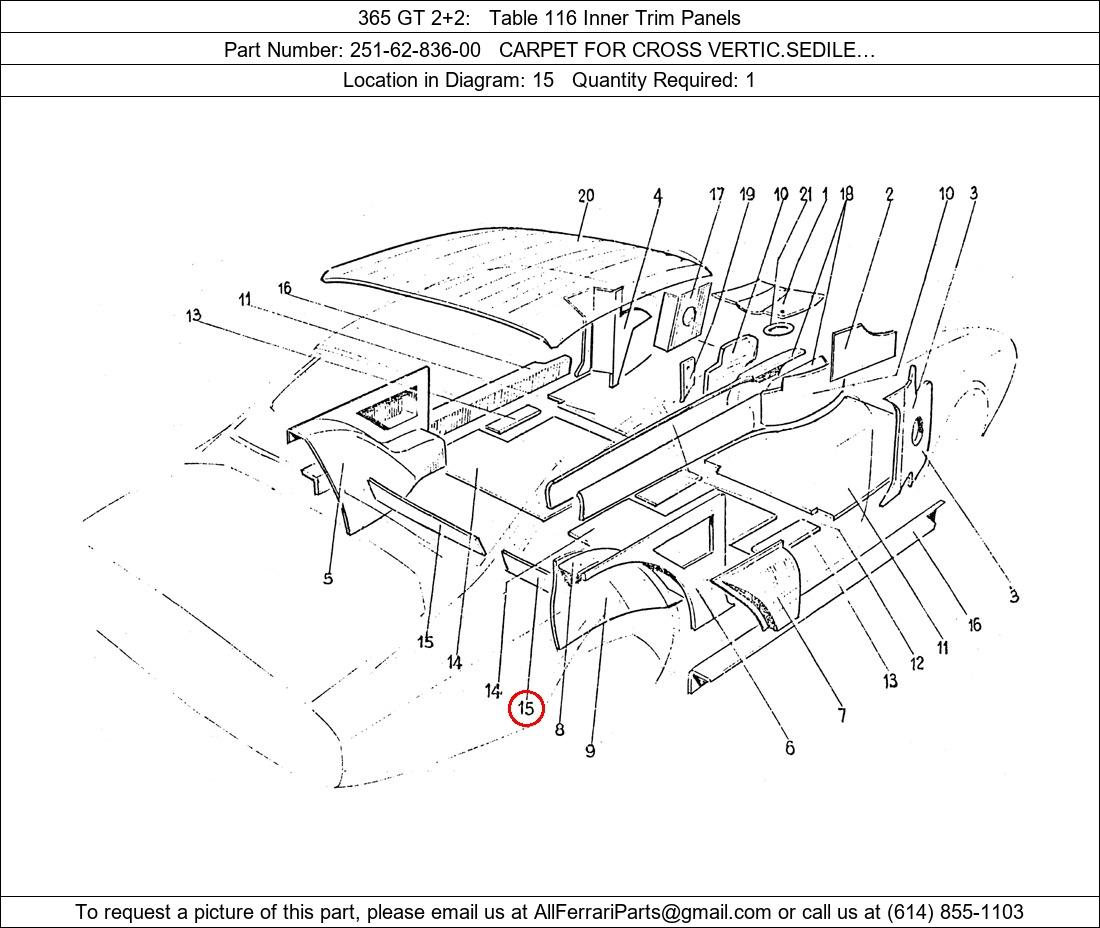 Ferrari Part Number 251-62-836-00, CARPET FOR CROSS VERTIC.SEDILE… shown here as used in 365 GT 2+2 Table 116 Inner Trim Panels. Location in Diagram: 15. Required Quantity: 1