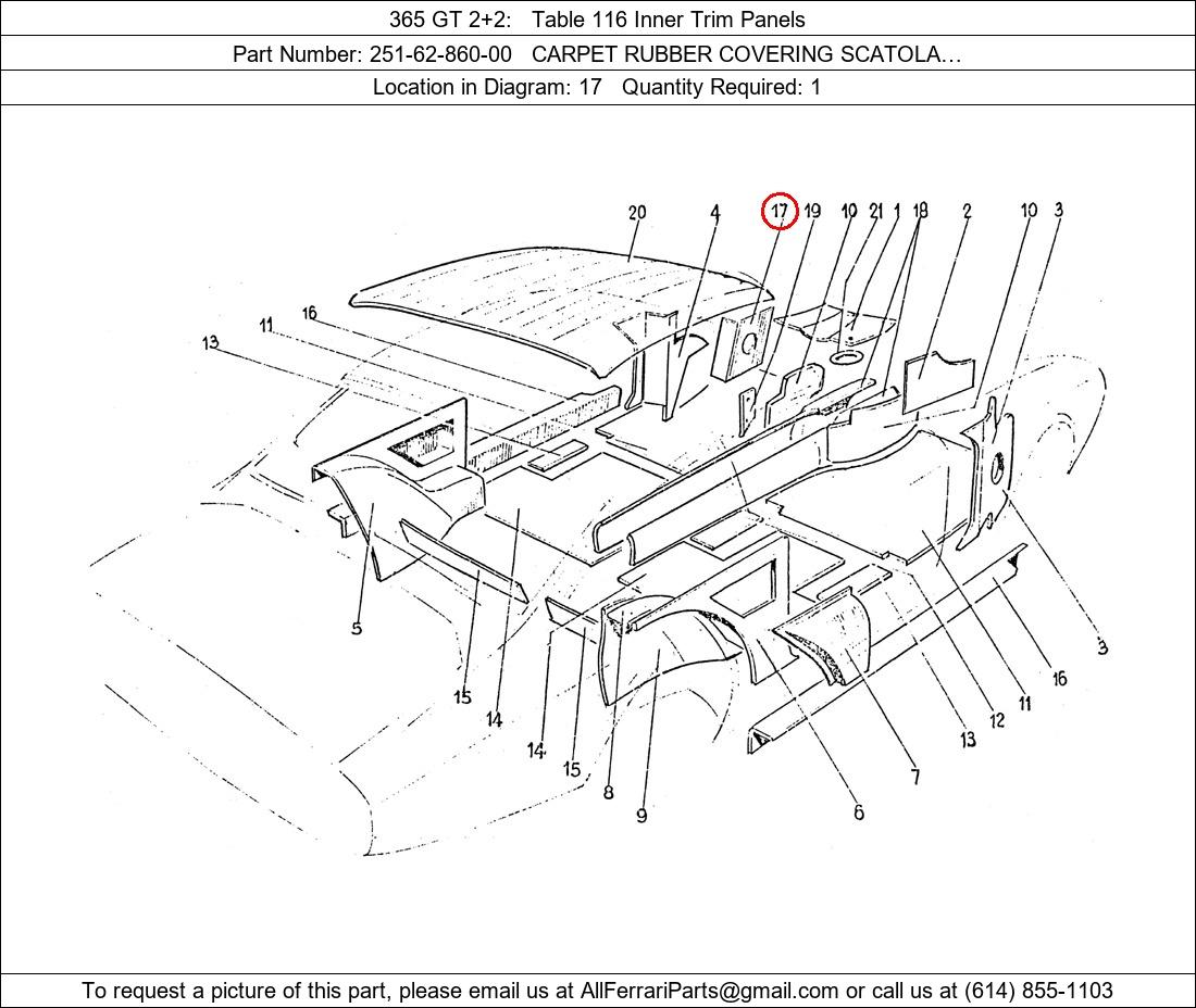 Ferrari Part Number 251-62-860-00, CARPET RUBBER COVERING SCATOLA… shown here as used in 365 GT 2+2 Table 116 Inner Trim Panels. Location in Diagram: 17. Required Quantity: 1