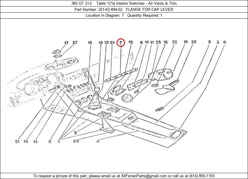 Ferrari Part Number 251-62-894-02, FLANGE FOR CAP LEVER shown here as used in 365 GT 2+2 Table 121a Interior Switches - Air Vents & Trim. Location in Diagram: 7. Required Quantity: 1. This Ferrari part is used in more than one diagram. Click on the diagrams below to see alternative uses of this part: