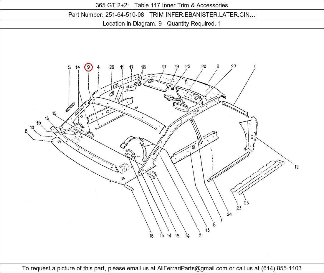 Ferrari Part Number 251-64-510-08, TRIM INFER.EBANISTER.LATER.CIN… shown here as used in 365 GT 2+2 Table 117 Inner Trim & Accessories. Location in Diagram: 9. Required Quantity: 1. This Ferrari part is used in more than one diagram. Click on the diagrams below to see alternative uses of this part: