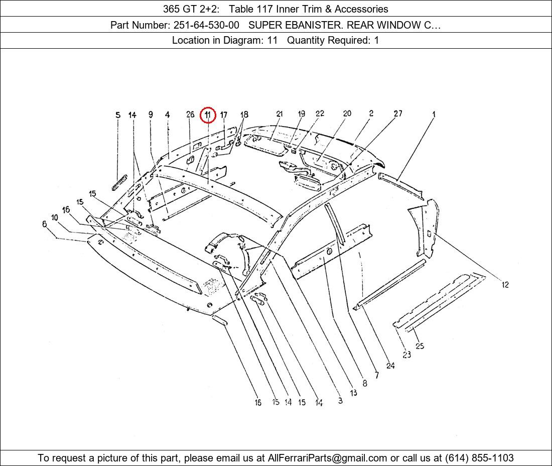 Ferrari Part Number 251-64-530-00, SUPER EBANISTER. REAR WINDOW C… shown here as used in 365 GT 2+2 Table 117 Inner Trim & Accessories. Location in Diagram: 11. Required Quantity: 1. This Ferrari part is used in more than one diagram. Click on the diagrams below to see alternative uses of this part: