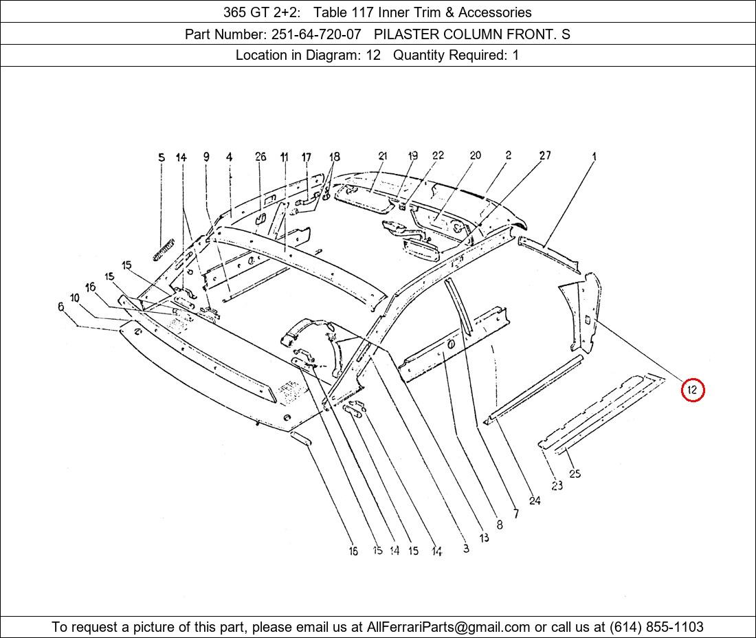 Ferrari Part Number 251-64-720-07, PILASTER COLUMN FRONT. S shown here as used in 365 GT 2+2 Table 117 Inner Trim & Accessories. Location in Diagram: 12. Required Quantity: 1. This Ferrari part is used in more than one diagram. Click on the diagrams below to see alternative uses of this part: