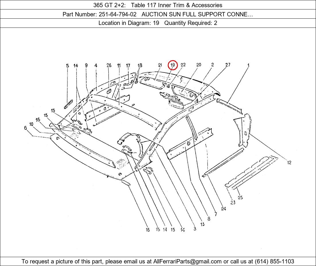 Ferrari Part Number 251-64-794-02, AUCTION SUN FULL SUPPORT CONNE… shown here as used in 365 GT 2+2 Table 117 Inner Trim & Accessories. Location in Diagram: 19. Required Quantity: 2. This Ferrari part is used in more than one diagram. Click on the diagrams below to see alternative uses of this part: