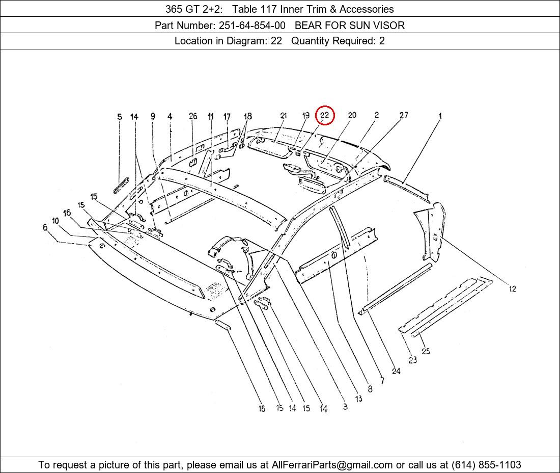 Ferrari Part Number 251-64-854-00, BEAR FOR SUN VISOR shown here as used in 365 GT 2+2 Table 117 Inner Trim & Accessories. Location in Diagram: 22. Required Quantity: 2. This Ferrari part is used in more than one diagram. Click on the diagrams below to see alternative uses of this part: