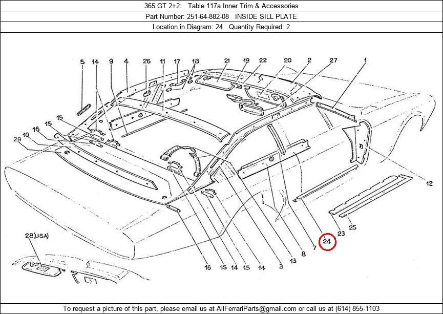 Ferrari Part Number 251-64-882-08, INSIDE SILL PLATE shown here as used in 365 GT 2+2 Table 117a Inner Trim & Accessories. Location in Diagram: 24. Required Quantity: 2. This Ferrari part is used in more than one diagram. Click on the diagrams below to see alternative uses of this part: