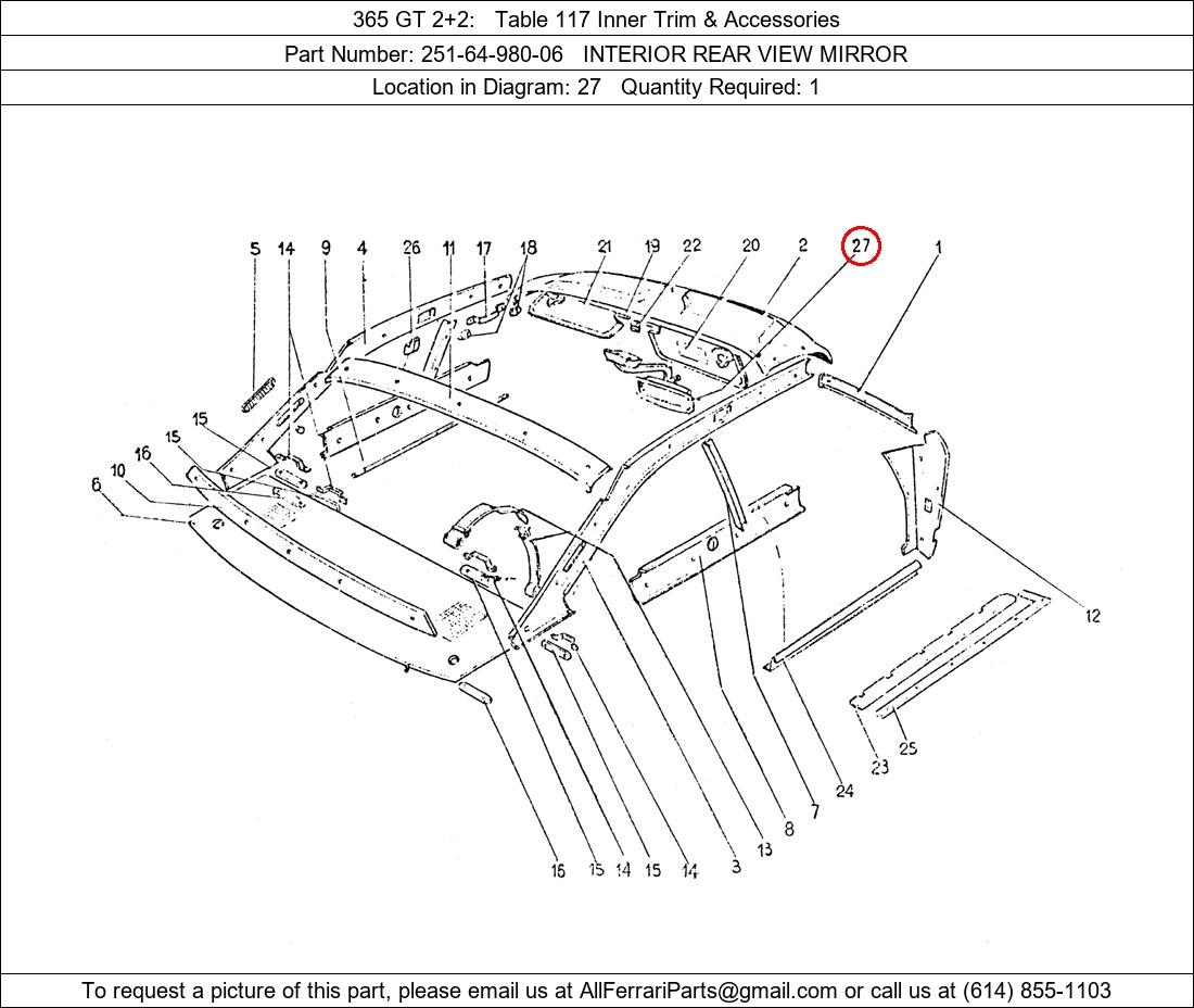 Ferrari Part Number 251-64-980-06, INTERIOR REAR VIEW MIRROR shown here as used in 365 GT 2+2 Table 117 Inner Trim & Accessories. Location in Diagram: 27. Required Quantity: 1. This Ferrari part is used in more than one diagram. Click on the diagrams below to see alternative uses of this part: