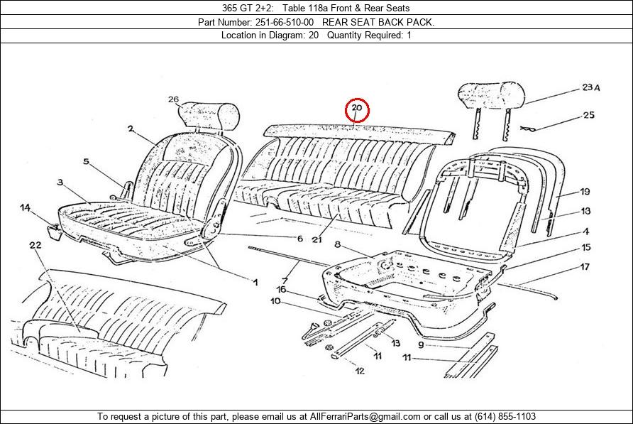 Ferrari Part Number 251-66-510-00, REAR SEAT BACK PACK. shown here as used in 365 GT 2+2 Table 118a Front & Rear Seats. Location in Diagram: 20. Required Quantity: 1. This Ferrari part is used in more than one diagram. Click on the diagrams below to see alternative uses of this part: