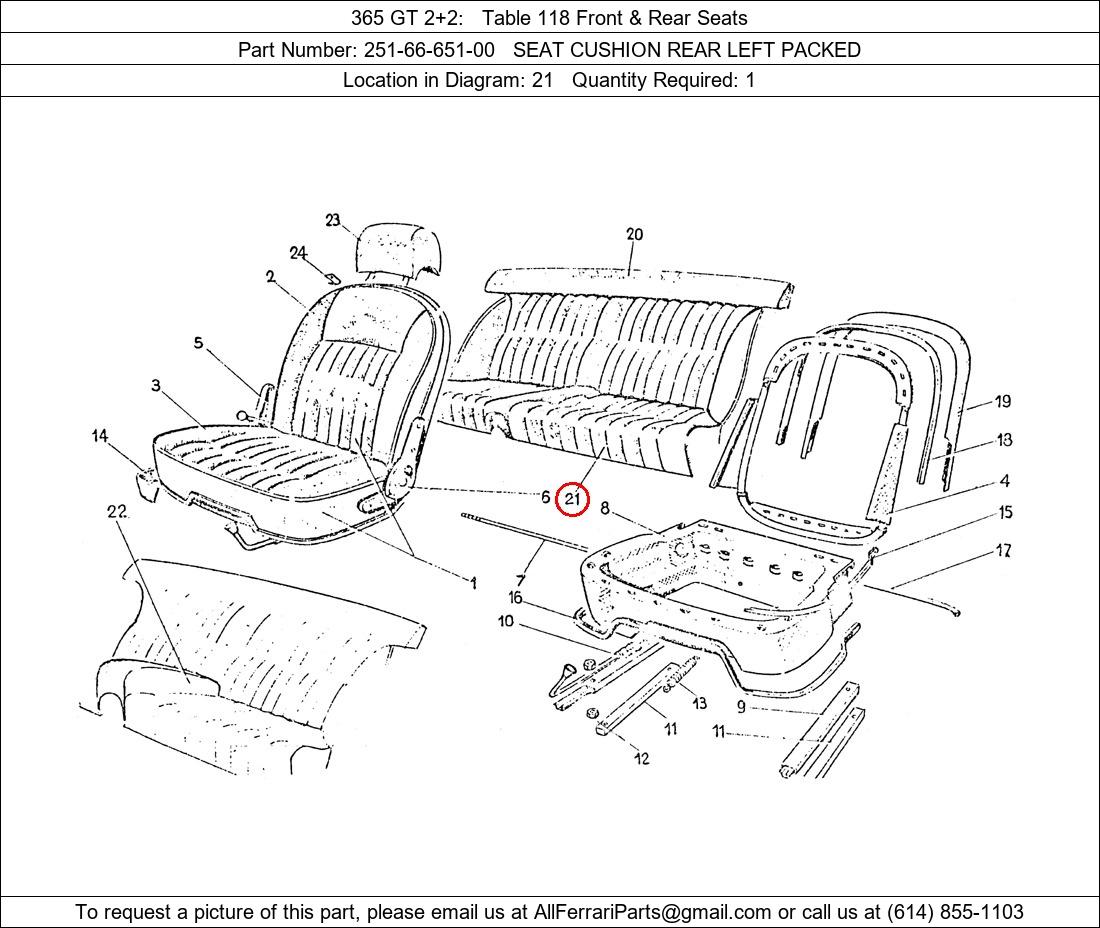 Ferrari Part Number 251-66-651-00, SEAT CUSHION REAR LEFT PACKED shown here as used in 365 GT 2+2 Table 118 Front & Rear Seats. Location in Diagram: 21. Required Quantity: 1. This Ferrari part is used in more than one diagram. Click on the diagrams below to see alternative uses of this part: