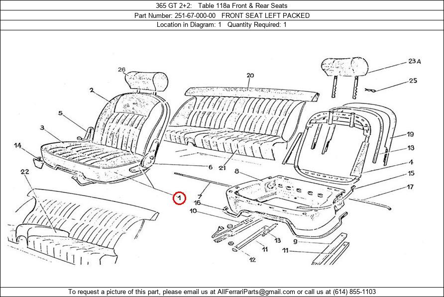 Ferrari Part Number 251-67-000-00, FRONT SEAT LEFT PACKED shown here as used in 365 GT 2+2 Table 118a Front & Rear Seats. Location in Diagram: 1. Required Quantity: 1. This Ferrari part is used in more than one diagram. Click on the diagrams below to see alternative uses of this part: