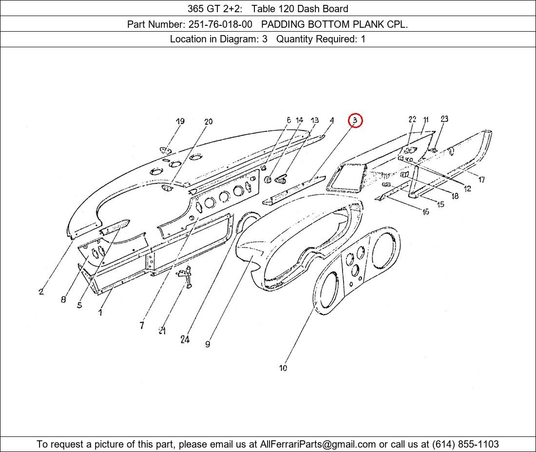 Ferrari Part Number 251-76-018-00, PADDING BOTTOM PLANK CPL. shown here as used in 365 GT 2+2 Table 120 Dash Board. Location in Diagram: 3. Required Quantity: 1. This Ferrari part is used in more than one diagram. Click on the diagrams below to see alternative uses of this part: