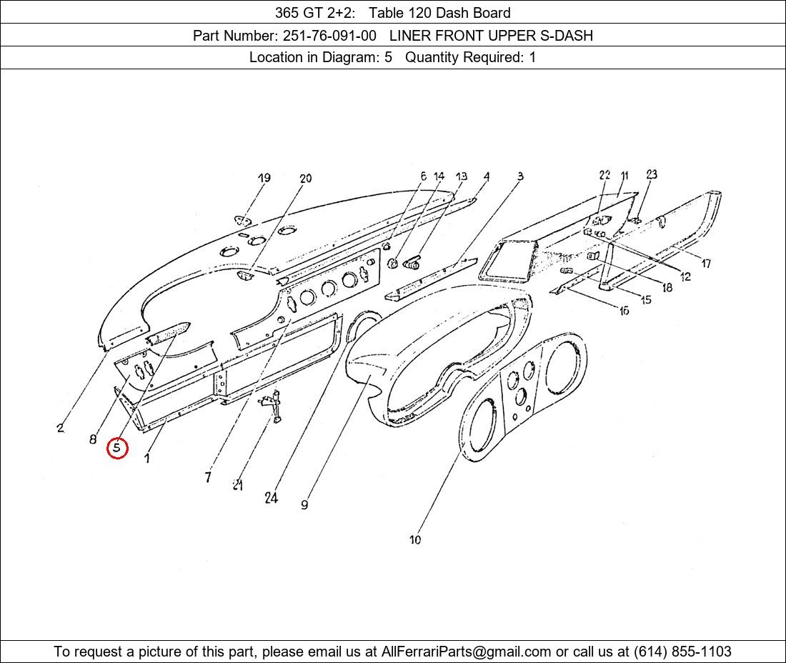 Ferrari Part Number 251-76-091-00, LINER FRONT UPPER S-DASH shown here as used in 365 GT 2+2 Table 120 Dash Board. Location in Diagram: 5. Required Quantity: 1. This Ferrari part is used in more than one diagram. Click on the diagrams below to see alternative uses of this part:
