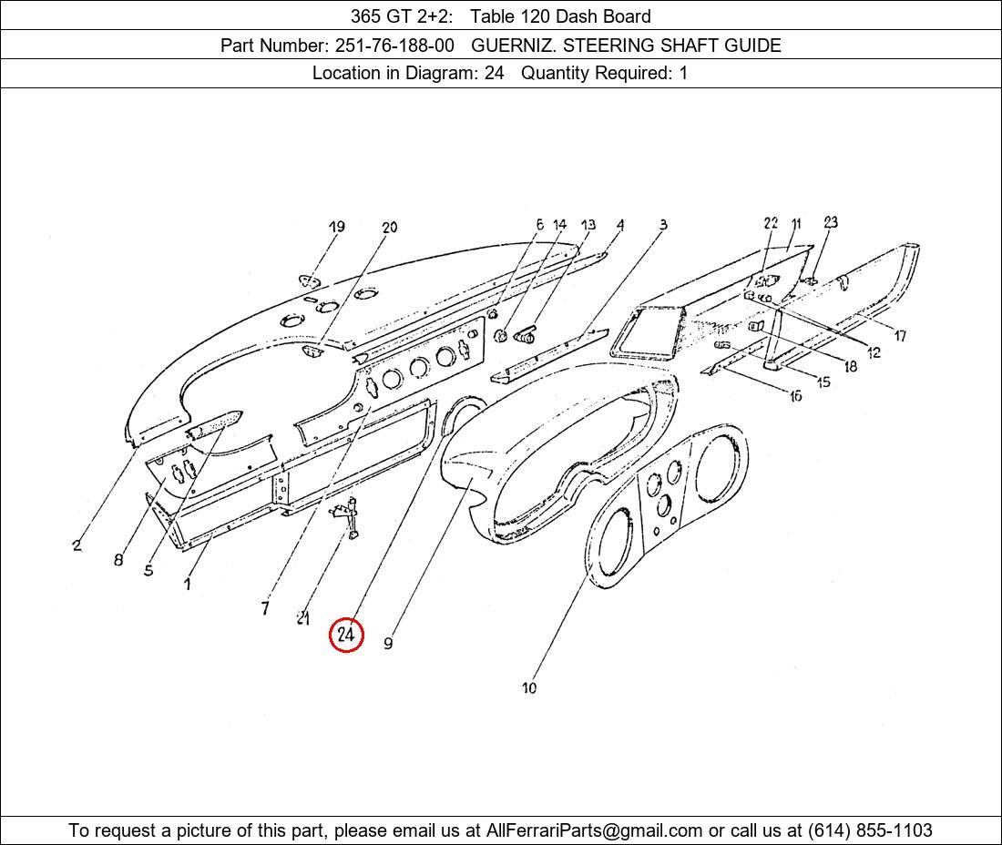 Ferrari Part Number 251-76-188-00, GUERNIZ. STEERING SHAFT GUIDE shown here as used in 365 GT 2+2 Table 120 Dash Board. Location in Diagram: 24. Required Quantity: 1. This Ferrari part is used in more than one diagram. Click on the diagrams below to see alternative uses of this part: