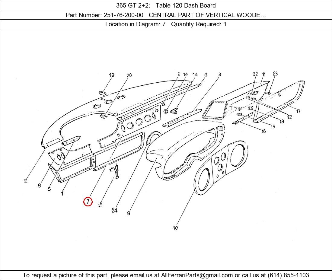 Ferrari Part Number 251-76-200-00, CENTRAL PART OF VERTICAL WOODE… shown here as used in 365 GT 2+2 Table 120 Dash Board. Location in Diagram: 7. Required Quantity: 1. This Ferrari part is used in more than one diagram. Click on the diagrams below to see alternative uses of this part: