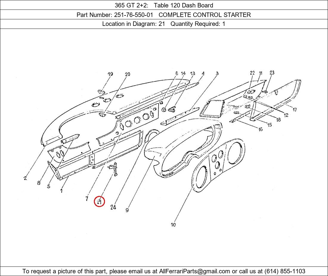 Ferrari Part Number 251-76-550-01, COMPLETE CONTROL STARTER shown here as used in 365 GT 2+2 Table 120 Dash Board. Location in Diagram: 21. Required Quantity: 1. This Ferrari part is used in more than one diagram. Click on the diagrams below to see alternative uses of this part: