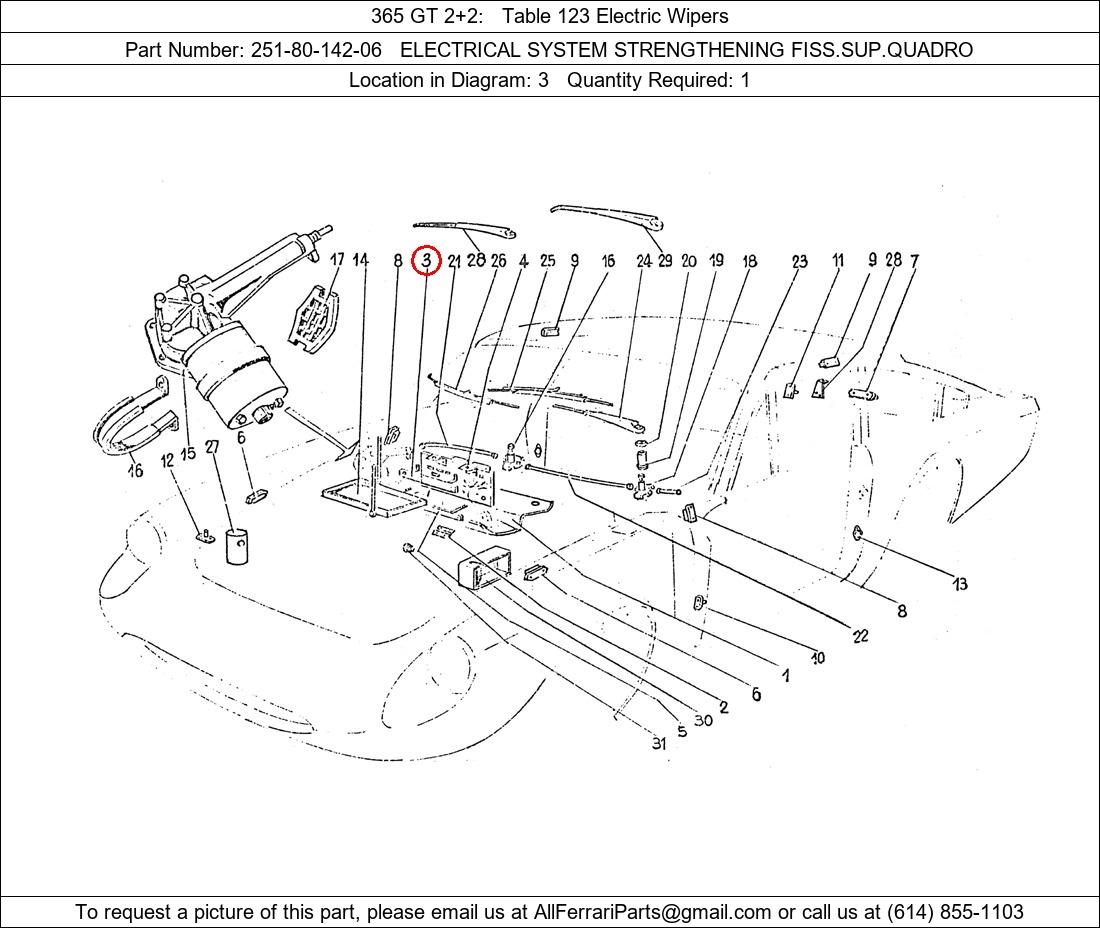 Ferrari Part Number 251-80-142-06, ELECTRICAL SYSTEM STRENGTHENING FISS.SUP.QUADRO shown here as used in 365 GT 2+2 Table 123 Electric Wipers. Location in Diagram: 3. Required Quantity: 1