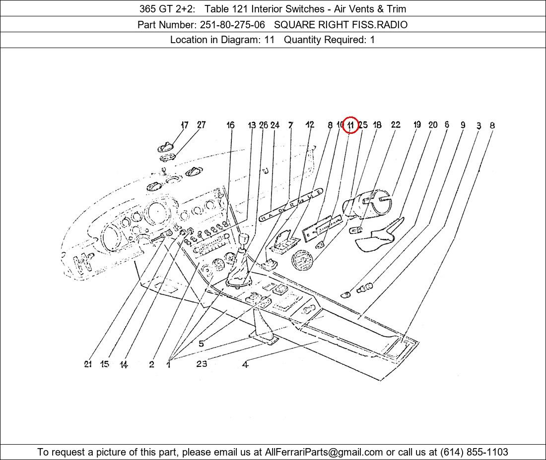 Ferrari Part Number 251-80-275-06, SQUARE RIGHT FISS.RADIO shown here as used in 365 GT 2+2 Table 121 Interior Switches - Air Vents & Trim. Location in Diagram: 11. Required Quantity: 1. This Ferrari part is used in more than one diagram. Click on the diagrams below to see alternative uses of this part: