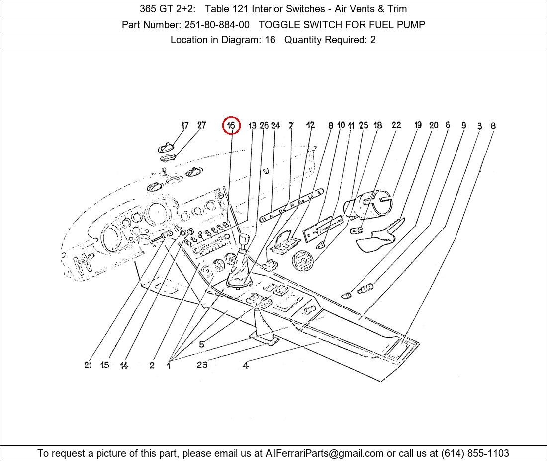 Ferrari Part Number 251-80-884-00, TOGGLE SWITCH FOR FUEL PUMP shown here as used in 365 GT 2+2 Table 121 Interior Switches - Air Vents & Trim. Location in Diagram: 16. Required Quantity: 2. This Ferrari part is used in more than one diagram. Click on the diagrams below to see alternative uses of this part:
