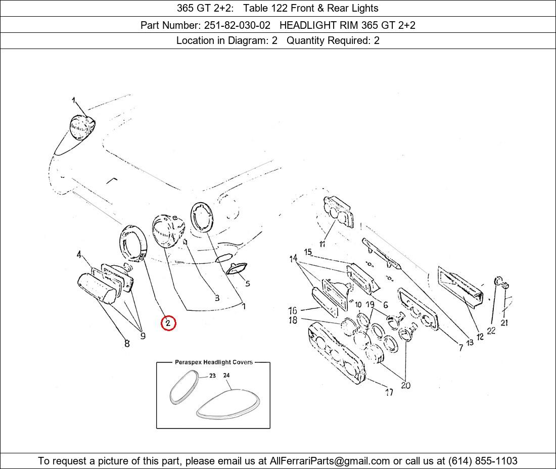 Ferrari Part Number 251-82-030-02, HEADLIGHT RIM 365 GT 2+2 shown here as used in 365 GT 2+2 Table 122 Front & Rear Lights. Location in Diagram: 2. Required Quantity: 2