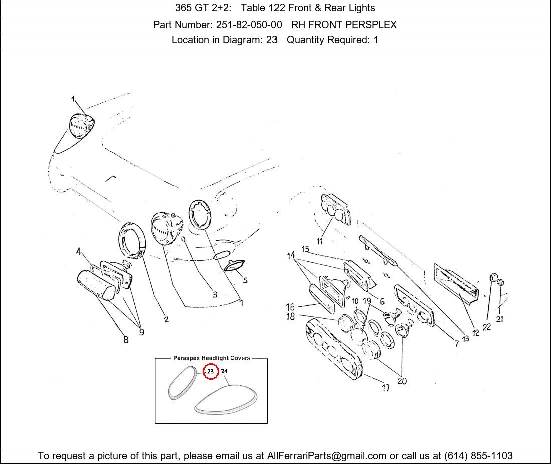 Ferrari Part Number 251-82-050-00, RH FRONT PERSPLEX shown here as used in 365 GT 2+2 Table 122 Front & Rear Lights. Location in Diagram: 23. Required Quantity: 1