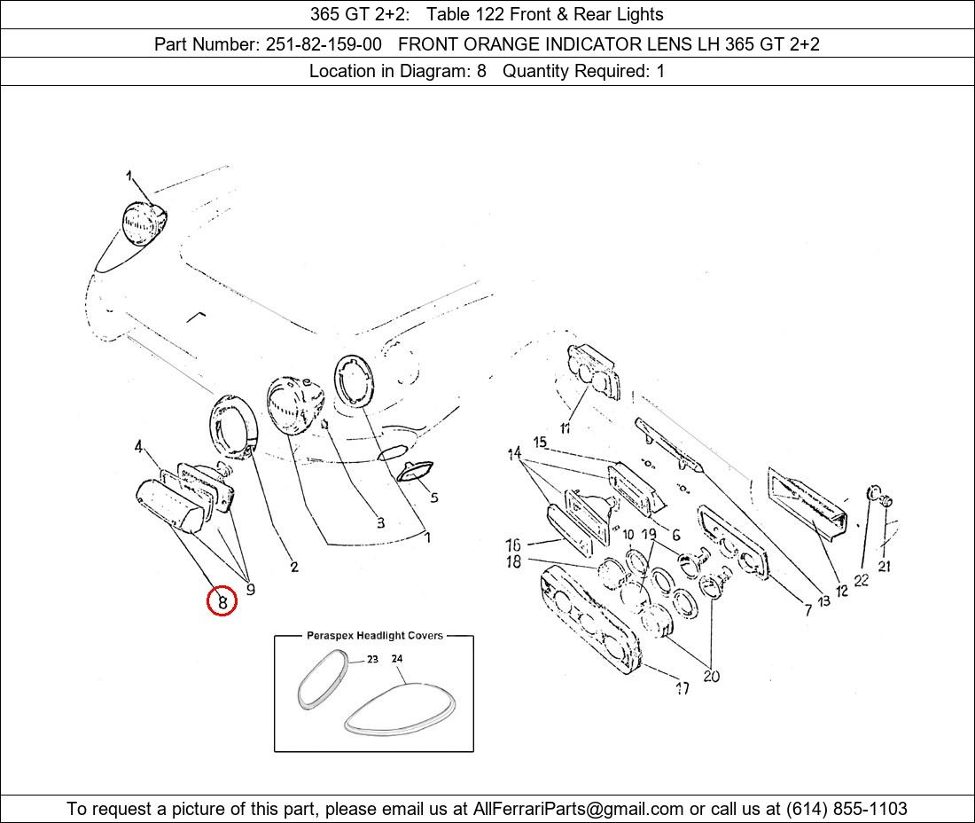 Ferrari Part Number 251-82-159-00, FRONT ORANGE INDICATOR LENS LH 365 GT 2+2 shown here as used in 365 GT 2+2 Table 122 Front & Rear Lights. Location in Diagram: 8. Required Quantity: 1