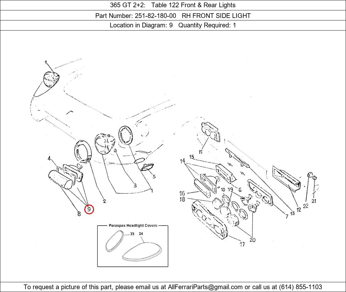 Ferrari Part Number 251-82-180-00, RH FRONT SIDE LIGHT shown here as used in 365 GT 2+2 Table 122 Front & Rear Lights. Location in Diagram: 9. Required Quantity: 1