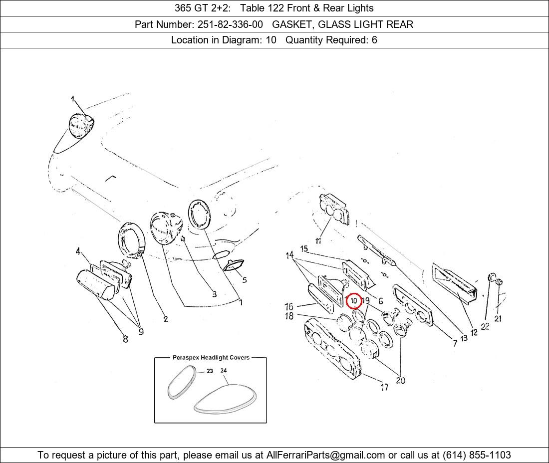Ferrari Part Number 251-82-336-00, GASKET, GLASS LIGHT REAR shown here as used in 365 GT 2+2 Table 122 Front & Rear Lights. Location in Diagram: 10. Required Quantity: 6