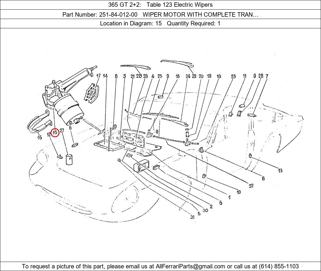Ferrari Part Number 251-84-012-00, WIPER MOTOR WITH COMPLETE TRAN… shown here as used in 365 GT 2+2 Table 123 Electric Wipers. Location in Diagram: 15. Required Quantity: 1