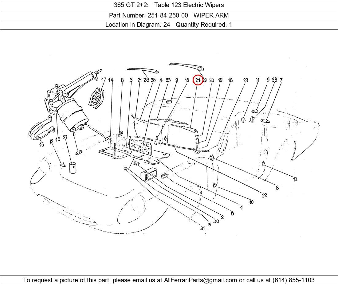 Ferrari Part Number 251-84-250-00, WIPER ARM shown here as used in 365 GT 2+2 Table 123 Electric Wipers. Location in Diagram: 24. Required Quantity: 1