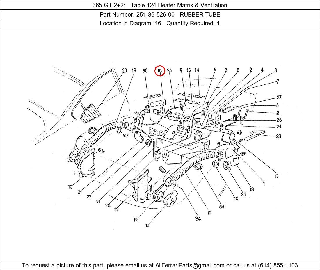 Ferrari Part Number 251-86-526-00, RUBBER TUBE shown here as used in 365 GT 2+2 Table 124 Heater Matrix & Ventilation. Location in Diagram: 16. Required Quantity: 1