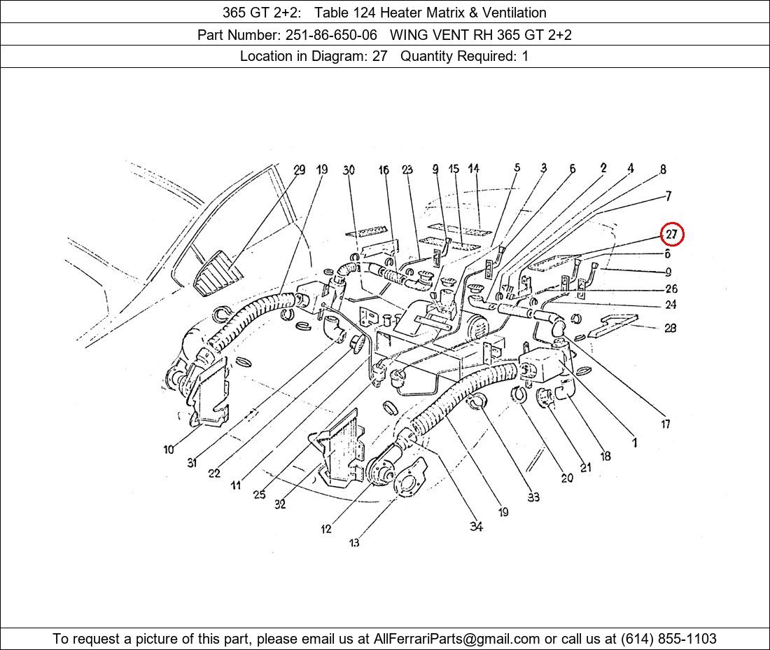 Ferrari Part Number 251-86-650-06, WING VENT RH 365 GT 2+2 shown here as used in 365 GT 2+2 Table 124 Heater Matrix & Ventilation. Location in Diagram: 27. Required Quantity: 1