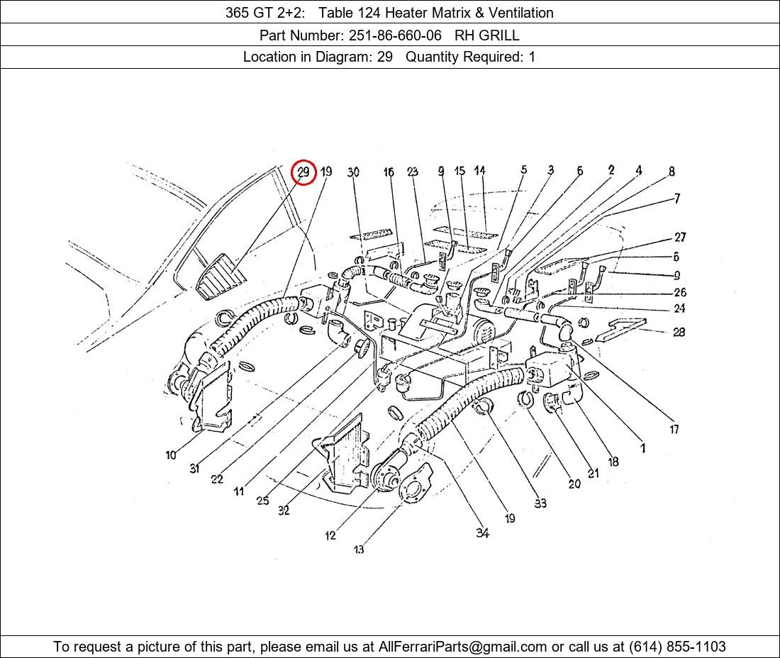 Ferrari Part Number 251-86-660-06, RH GRILL shown here as used in 365 GT 2+2 Table 124 Heater Matrix & Ventilation. Location in Diagram: 29. Required Quantity: 1