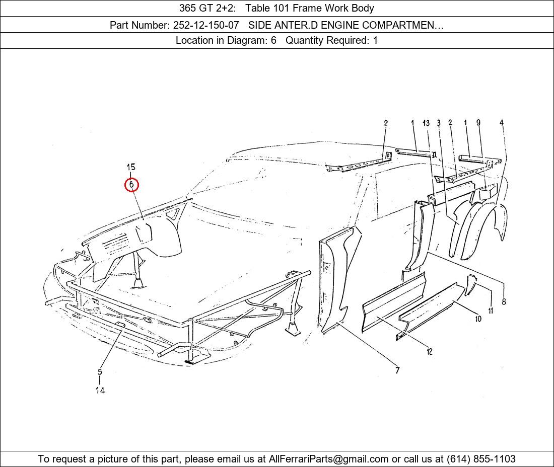 Ferrari Part Number 252-12-150-07, SIDE ANTER.D ENGINE COMPARTMEN… shown here as used in 365 GT 2+2 Table 101 Frame Work Body. Location in Diagram: 6. Required Quantity: 1