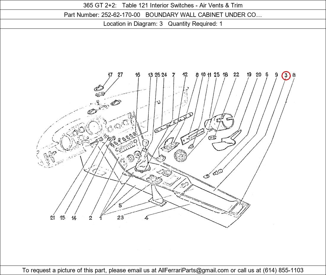 Ferrari Part Number 252-62-170-00, BOUNDARY WALL CABINET UNDER CO… shown here as used in 365 GT 2+2 Table 121 Interior Switches - Air Vents & Trim. Location in Diagram: 3. Required Quantity: 1. This Ferrari part is used in more than one diagram. Click on the diagrams below to see alternative uses of this part: