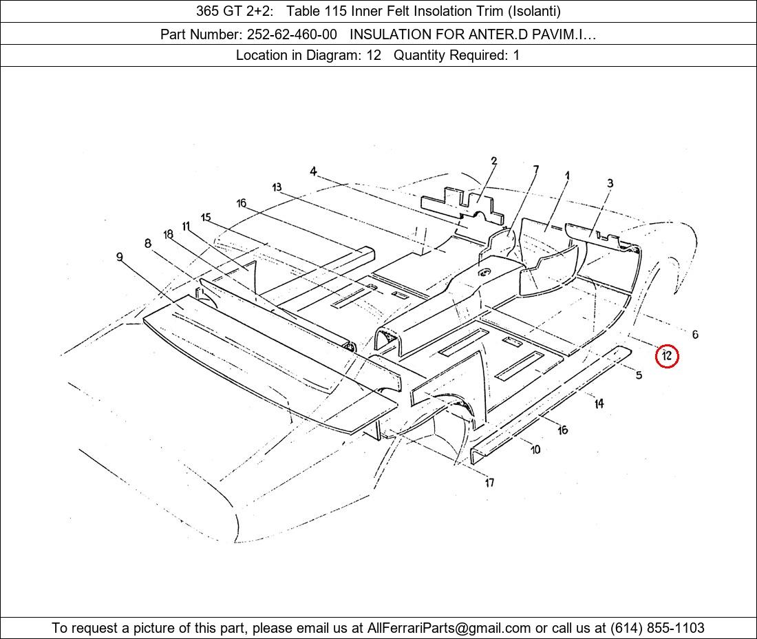 Ferrari Part Number 252-62-460-00, INSULATION FOR ANTER.D PAVIM.I… shown here as used in 365 GT 2+2 Table 115 Inner Felt Insolation Trim (Isolanti). Location in Diagram: 12. Required Quantity: 1